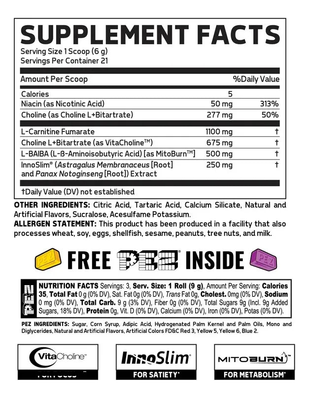 Cada porción (6 g) contiene aproximadamente 0-5 calorías (principalmente de edulcorantes). Incluye 500 mg MitoBurn, 250 mg InnoSlim, 40 mg CaloriBurn GP, 25 mg ProGBB. Sin carbohidratos, proteínas o grasas significativas.