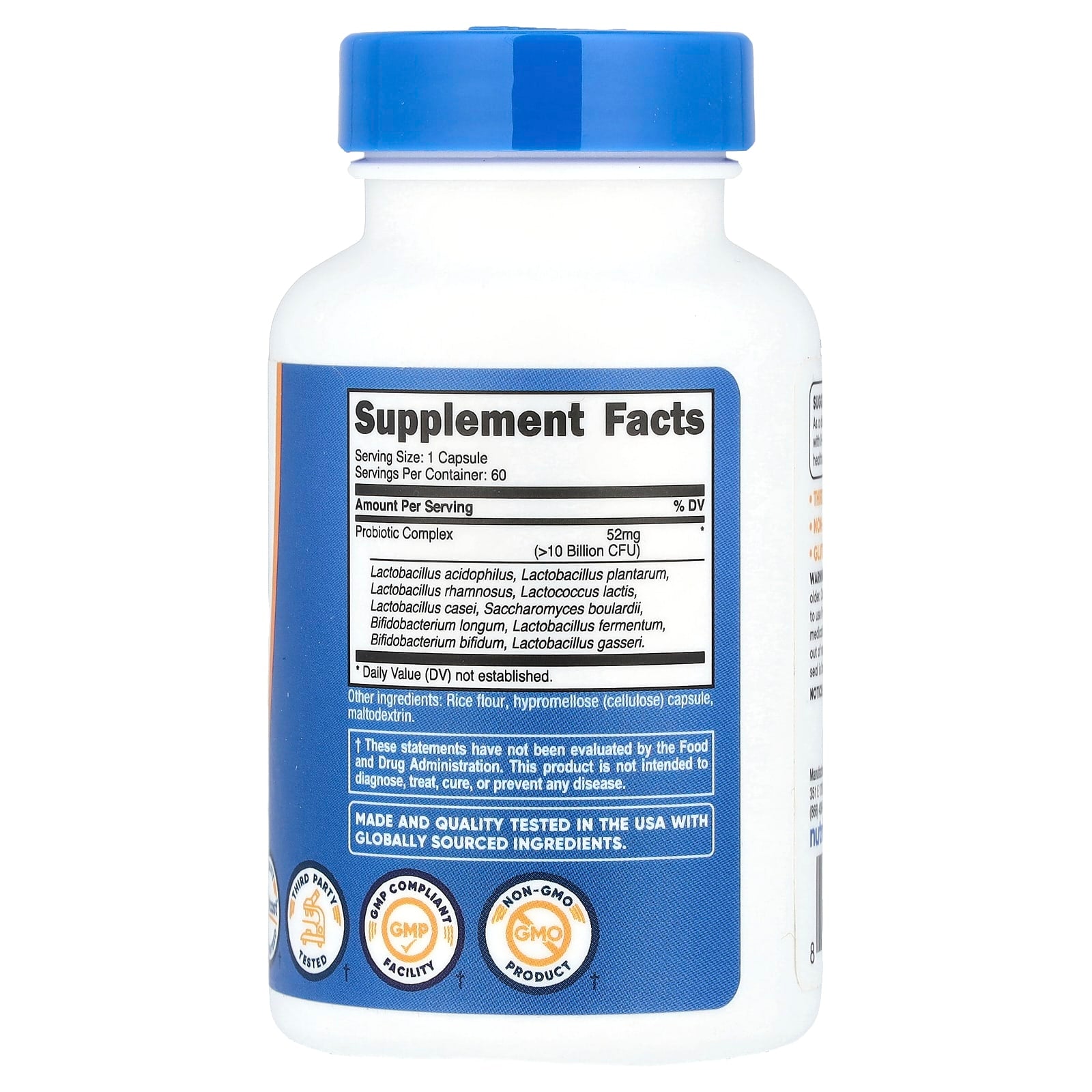 Nutricost Complejo Probiótico es tu aliado para una salud digestiva óptima. Cada frasco contiene 60 cápsulas, proporcionando 60 porciones con 10.000 millones de UFC de 10 cepas probióticas de alta calidad, incluyendo Lactobacillus acidophilus, Bifidobacterium longum y Saccharomyces boulardii. Este suplemento vegano, sin gluten y sin OGM está fabricado en instalaciones que cumplen con las Buenas Prácticas de Manufactura (GMP) y ha sido probado por terceros para garantizar su calidad.